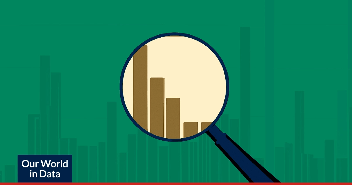 The chart shows the data that answers this question. In blue, we see the global decline. In red, we see the decline if we exclude China from the data. In the world outside of China, 33% lived in extreme poverty in 1990; by 2025, this share was down to 12%.