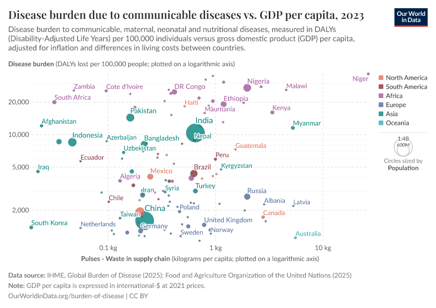 The burden of disease due to communicable diseases vs GDP per capita is shown in the following charts.