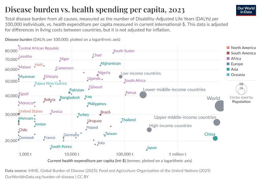 The chart below shows the relationship between the total burden of disease versus average health expenditure per person, measured in US dollars.