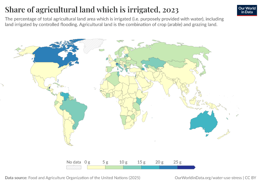 Data coverage on the use of irrigation is less complete. But as you can see on the map, there are large differences in rates of irrigation even along the tropics and sub-tropics. More than 75% of farmland in Bangladesh and 40% in India is irrigated, compared to less than 1% in Ethiopia, Nigeria and Niger. It would also be reasonable to assume that countries without available data — particularly across Sub-Saharan Africa — also have very poor access to irrigation.