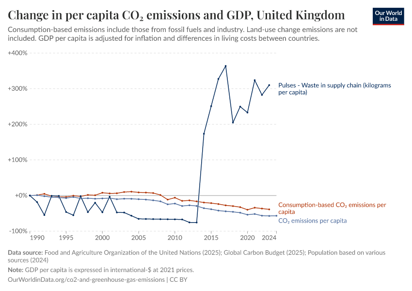 Take the UK as an example. It is shown in the chart. This chart shows the change in GDP and annual CO2 emissions per capita since 1990. We see that the UK’s GDP has increased a lot over the last 30 years while its emissions have fallen. You can also see the data without per capita adjustments.