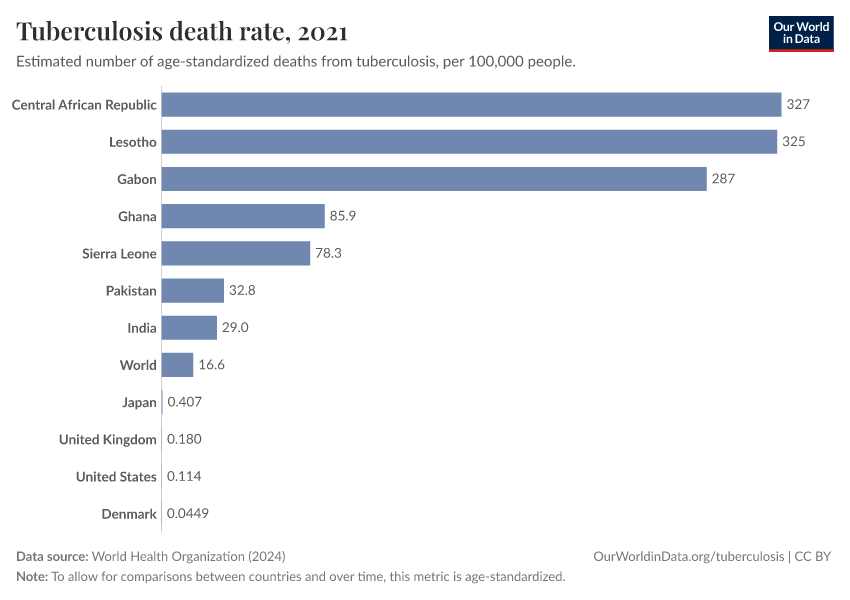 Someone in Lesotho, the Central African Republic, or Gabon is at least 3,000 times more likely to die from TB than someone in the United States or Denmark. You can see these huge differences in death rates in the chart below.
