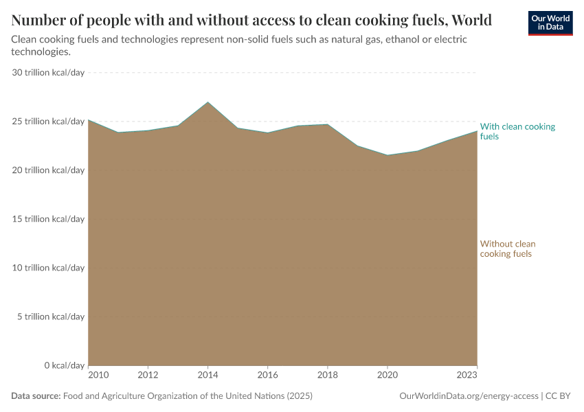The total number of people globally without clean cooking fuels has slowly declined since 2000.
