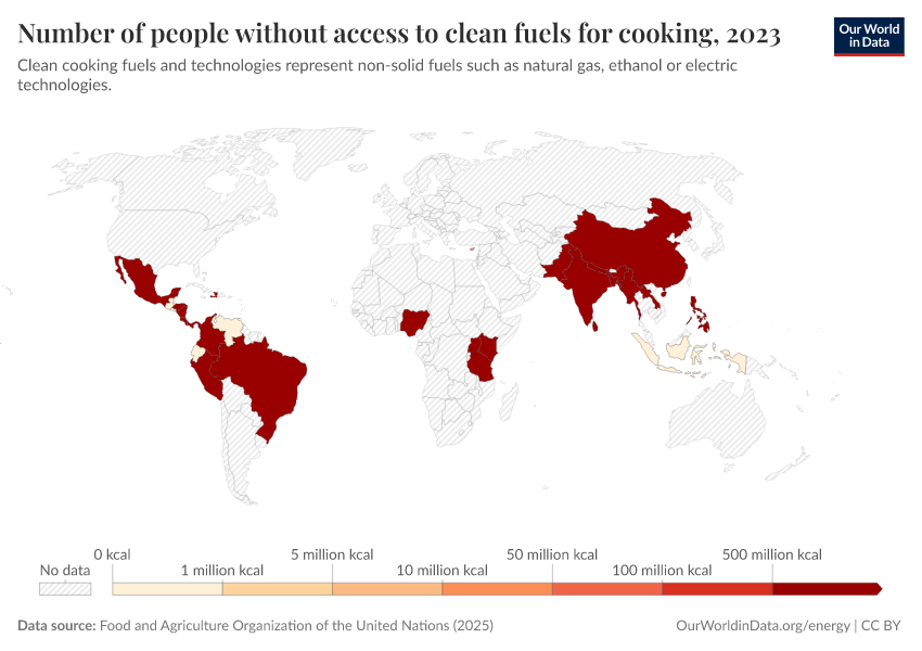 In the visualizations here, we see the number of people globally with and without clean cooking fuels and a world map of the number without access.