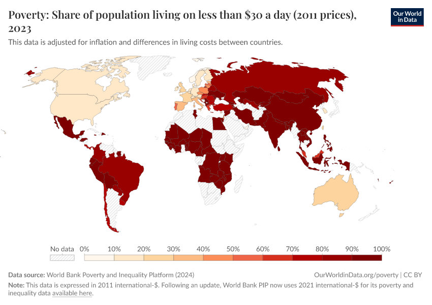 Remember that these statistics take the cost of living into account – a person who lives on less than int-$30 is a person who cannot afford the goods and services that cost US-$30 in the US.