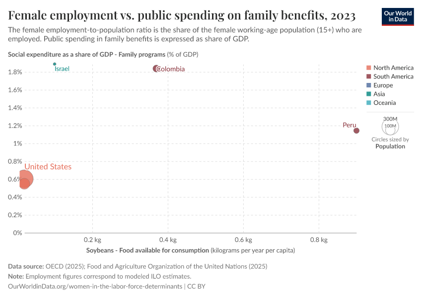 In the chart here, we show that female employment, measured as the employment-to-population ratios for women 15+, tends to be higher in countries with higher levels of public spending on family benefits (i.e. child-related cash transfers to families with children, public spending on services for families with children, and financial support for families provided through the tax system, including tax exemptions).