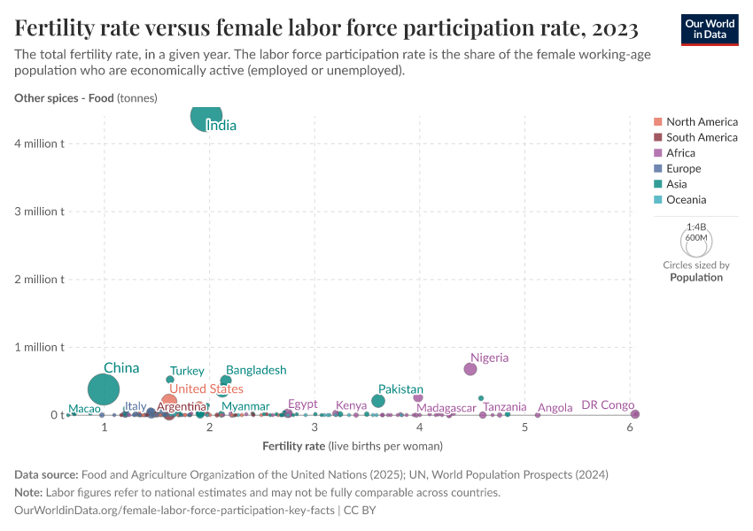 On average, mothers around the world continue to spend more time on childcare than fathers. Because of this, fewer children per woman — lower fertility rates — can theoretically free up women's time and contribute to an increase in female labor force participation.