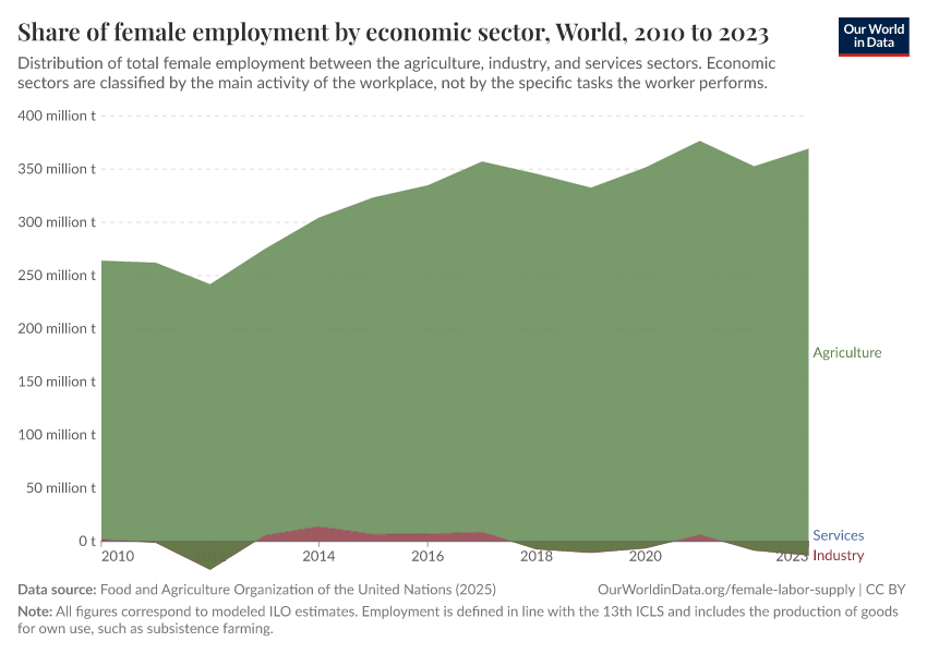 This shows how women’s employment is distributed across sectors. In many countries, most women work in services, while smaller shares work in industry or agriculture. You can add and remove countries to see how this varies around the world.
