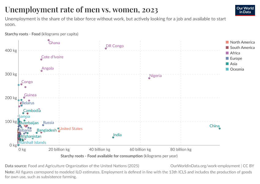 On the right-hand side of the chart, most countries lie significantly above the diagonal line — so in countries where unemployment is more common, women tend to be disproportionately affected.