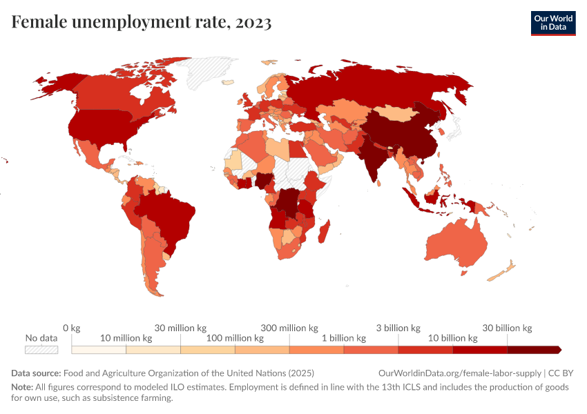 The map shows unemployment rates for women across the world. As we can see, the highest female unemployment rates are concentrated in North Africa and the Middle East, and correspond to the countries where female labor force participation is also low.