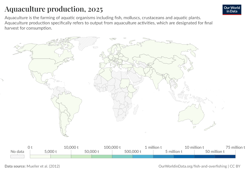 We can break this down by wild catch and fish farming. But let’s first look at total production from the sum of these two methods. This is shown in the map here. China is the world’s largest seafood producer.