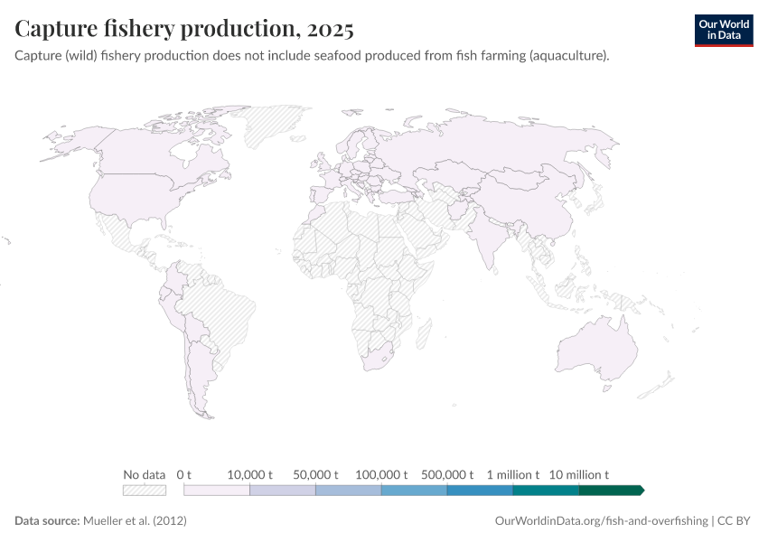 The chart here shows the distribution of wild fish catch by country. This is total seafood production minus aquaculture (fish farming).