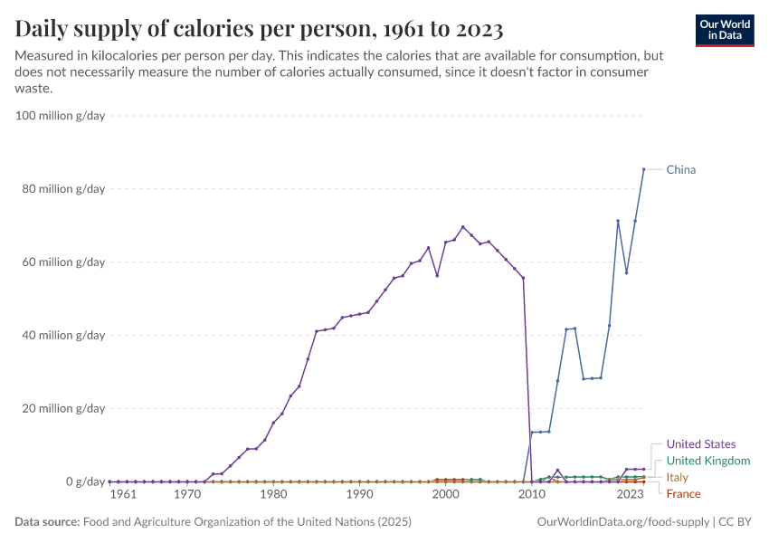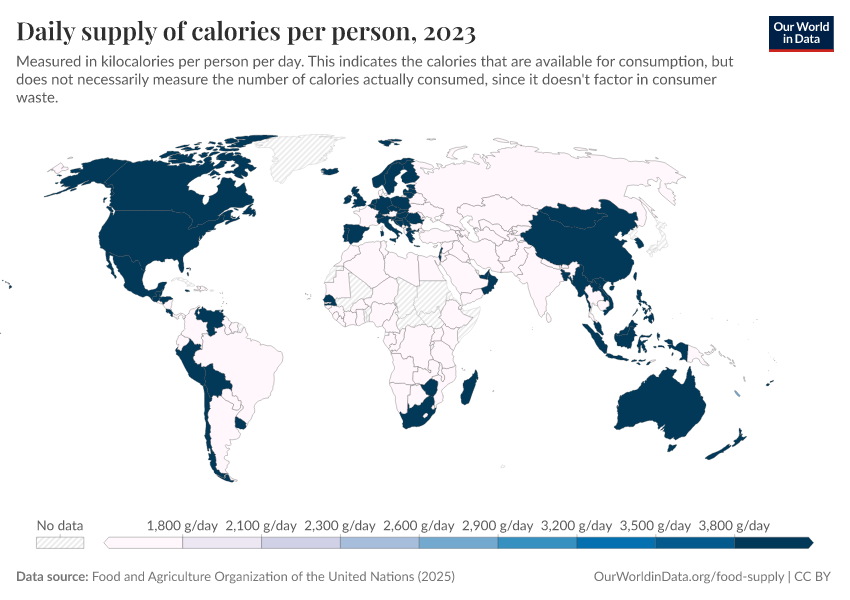 Max Roser, Hannah Ritchie, and Pablo Rosado (2013) - “Food Supply” Published online at OurWorldinData.org. Retrieved from: 'https://refactor-hide-legend.owid.pages.dev/food-supply' [Online Resource]BibTeX citation