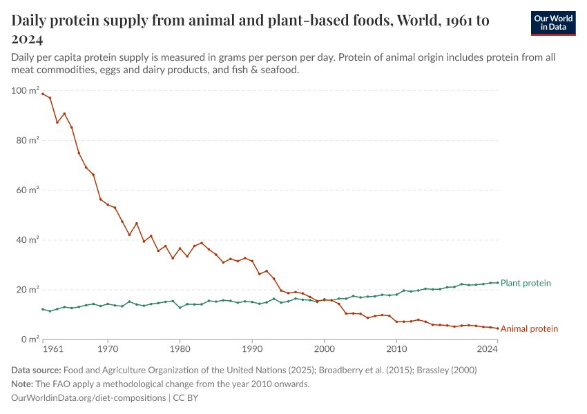 Not only has the quantity of protein supply evolved over time, but so has its composition, originating from various sources. As elaborated in more detail in our Diet Compositions topic page, our dietary intake has witnessed changes in the consumption of animal and plant-based foods.