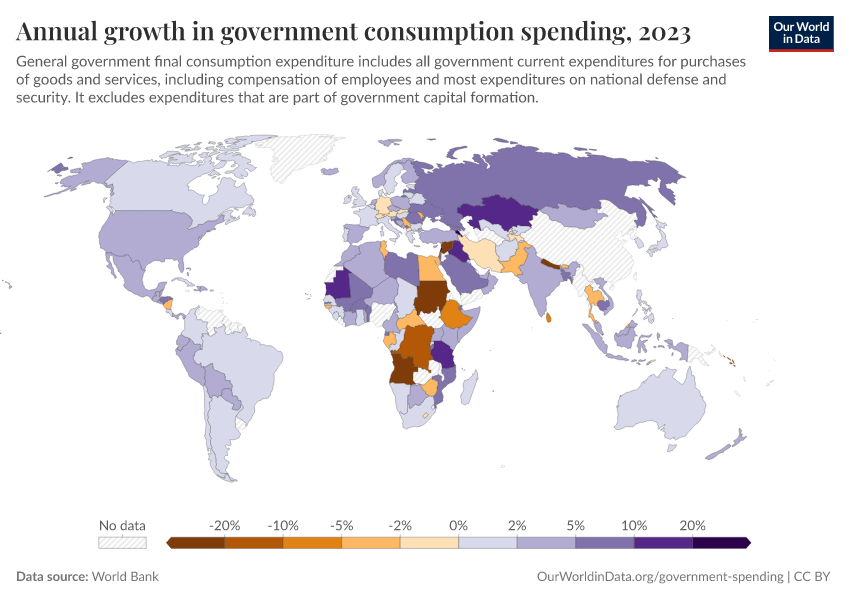 “Data Page: Annual growth in government consumption spending”. Our World in Data (2026). Data adapted from World Bank. Retrieved from https://refactor-hide-legend.owid.pages.dev/grapher/annual-growth-of-general-government-final-consumption-expenditure [online resource]How to cite this data