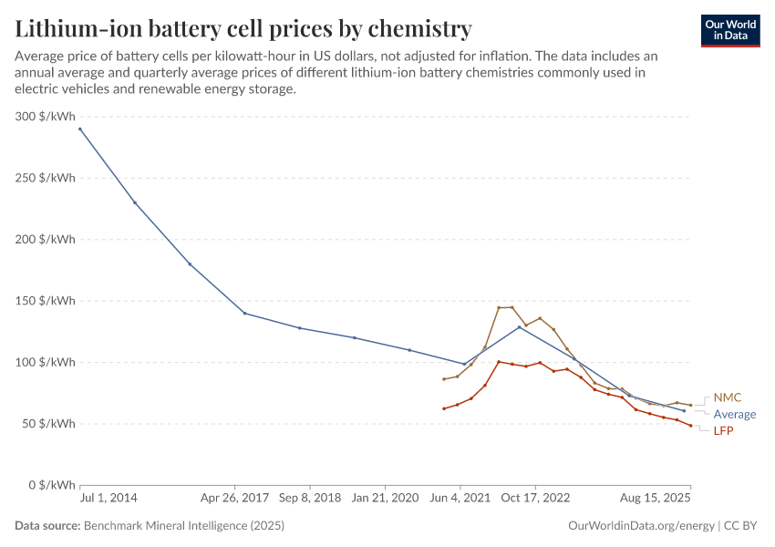 “Data Page: Lithium-ion battery cell prices by chemistry”, part of the following publication: Hannah Ritchie, Pablo Rosado, and Max Roser (2023) - “Energy”. Data adapted from Benchmark Mineral Intelligence. Retrieved from https://refactor-hide-legend.owid.pages.dev/grapher/average-battery-cell-price [online resource]How to cite this data