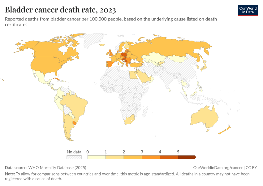 “Data Page: Bladder cancer death rate”, part of the following publication: Saloni Dattani, Fiona Spooner, Hannah Ritchie, and Max Roser (2023) - “Causes of Death”. Data adapted from WHO Mortality Database. Retrieved from https://refactor-hide-legend.owid.pages.dev/grapher/bladder-cancer-death-rate [online resource]How to cite this data