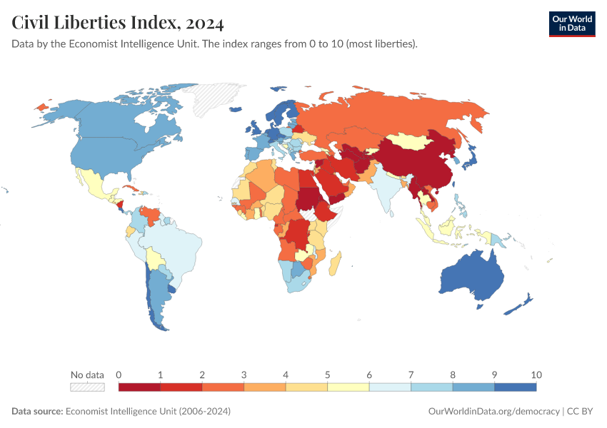 Economist Intelligence Unit (2006-2024) – processed by Our World in Data. “Civil Liberties Index” [dataset]. Economist Intelligence Unit, “Democracy Index 2021: The China challenge”; Economist Intelligence Unit, “Democracy Index 2022: Frontline democracy and the battle for Ukraine”; Economist Intelligence Unit, “Democracy Index 2023: Age of Conflict”; Economist Intelligence Unit, “Democracy Index 2024: What's wrong with representative democracy?”; Gapminder, “Democracy Index v4”; Various sources, “Population” [original data]. Retrieved March 4, 2026 from https://refactor-hide-legend.owid.pages.dev/grapher/civil-liberties-index-eiu
