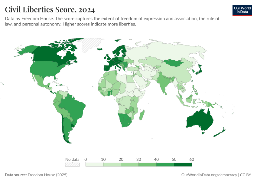 Freedom House (2025) – processed by Our World in Data. “Civil Liberties Score” [dataset]. Freedom House, “Freedom in the World” [original data]. Retrieved March 4, 2026 from https://refactor-hide-legend.owid.pages.dev/grapher/civil-liberties-score-fh