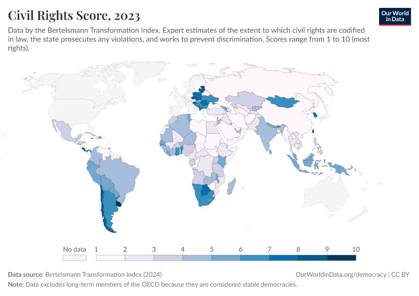 Bertelsmann Transformation Index (2024) – processed by Our World in Data. “Civil Rights Score” [dataset]. Bertelsmann Transformation Index, “Bertelsmann Transformation Index, Scores” [original data]. Retrieved March 4, 2026 from https://refactor-hide-legend.owid.pages.dev/grapher/civil-rights-score-bti