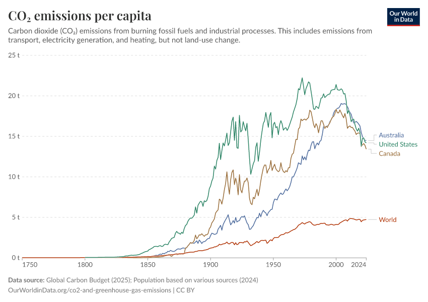 Global Carbon Budget (2025); Population based on various sources (2024) – with major processing by Our World in Data. “CO₂ emissions per capita” [dataset]. Global Carbon Project, “Global Carbon Budget v15”; Various sources, “Population” [original data]. Retrieved March 4, 2026 from https://refactor-hide-legend.owid.pages.dev/grapher/co-emissions-per-capita