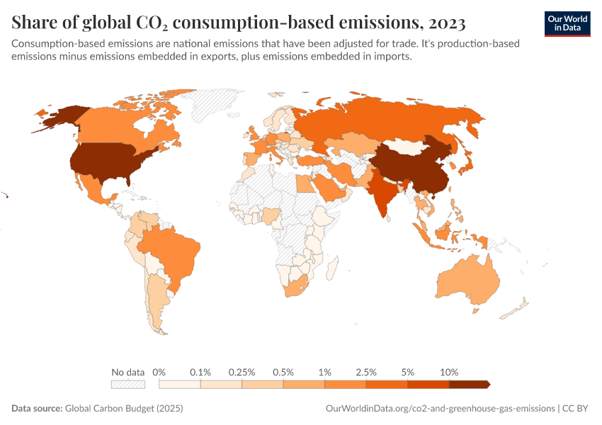 “Data Page: Share of global CO₂ consumption-based emissions”, part of the following publication: Hannah Ritchie, Pablo Rosado, and Max Roser (2023) - “CO₂ and Greenhouse Gas Emissions”. Data adapted from Global Carbon Project. Retrieved from https://refactor-hide-legend.owid.pages.dev/grapher/co2-consumption-share [online resource]How to cite this data