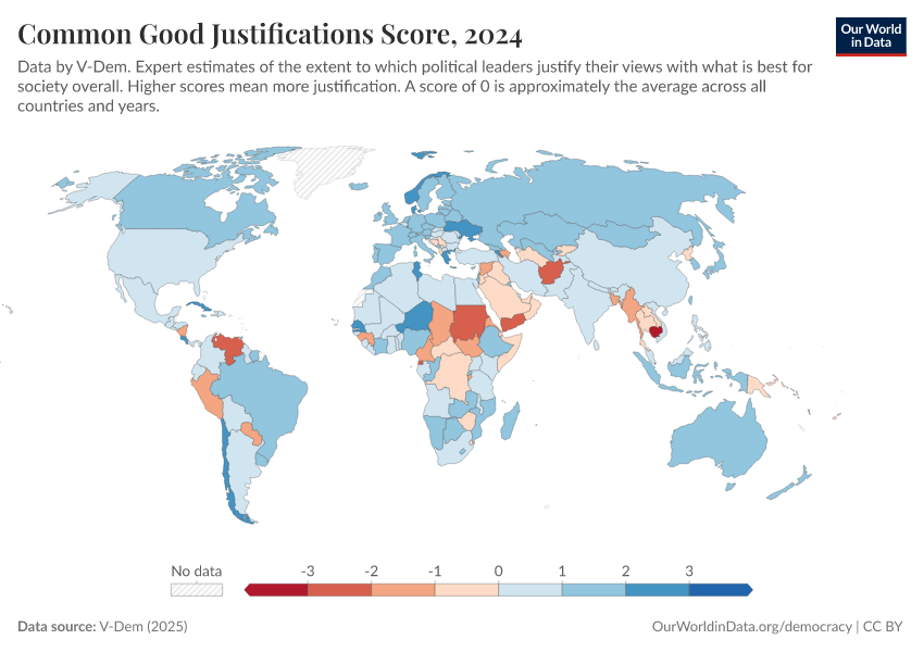 “Data Page: Common good justifications”, part of the following publication: Bastian Herre, Lucas Rodés-Guirao, and Esteban Ortiz-Ospina (2013) - “Democracy”. Data adapted from V-Dem. Retrieved from https://refactor-hide-legend.owid.pages.dev/grapher/common-good-justifications-score [online resource]How to cite this data