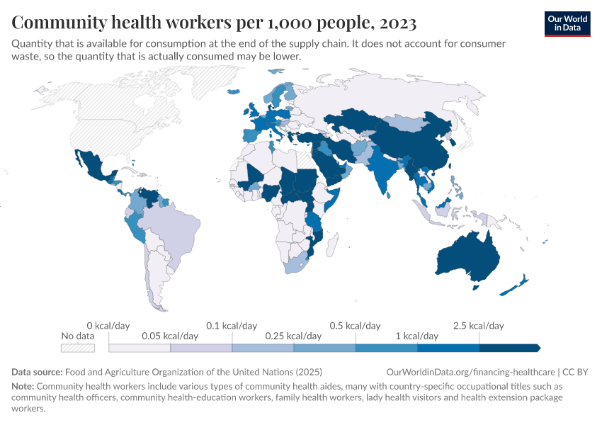 World Health Organization (Global Health Workforce Statistics), OECD, and country data, via World Bank (2026) – processed by Our World in Data. “Community health workers per 1,000 people” [dataset]. World Health Organization (Global Health Workforce Statistics), OECD, and country data, via World Bank, “World Development Indicators 125” [original data]. Retrieved March 4, 2026 from https://refactor-hide-legend.owid.pages.dev/grapher/community-health-workers