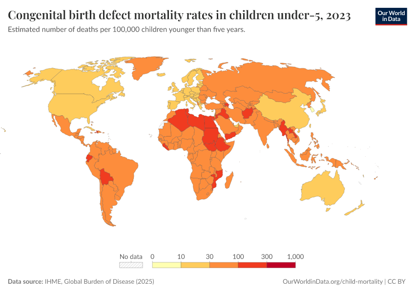 IHME, Global Burden of Disease (2025) – with major processing by Our World in Data. “Congenital birth defect mortality rates in children under-5” [dataset]. IHME, Global Burden of Disease, “Global Burden of Disease - Deaths” [original data]. Retrieved March 4, 2026 from https://refactor-hide-legend.owid.pages.dev/grapher/congenital-birth-defect-mortality-rates-in-children-under-5