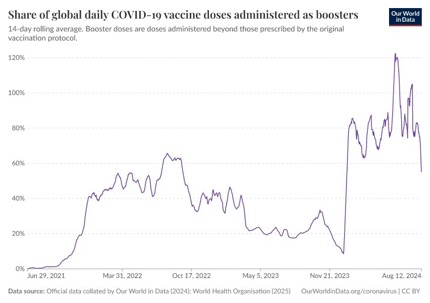 Official data collated by Our World in Data (2024); World Health Organisation (2025) – with major processing by Our World in Data. “Share of global daily COVID-19 vaccine doses administered as boosters” [dataset]. Official data collated by Our World in Data, “COVID-19, vaccinations”; World Health Organisation, “COVID-19, vaccinations (WHO)” [original data]. Retrieved March 4, 2026 from https://refactor-hide-legend.owid.pages.dev/grapher/covid-vaccine-share-boosters