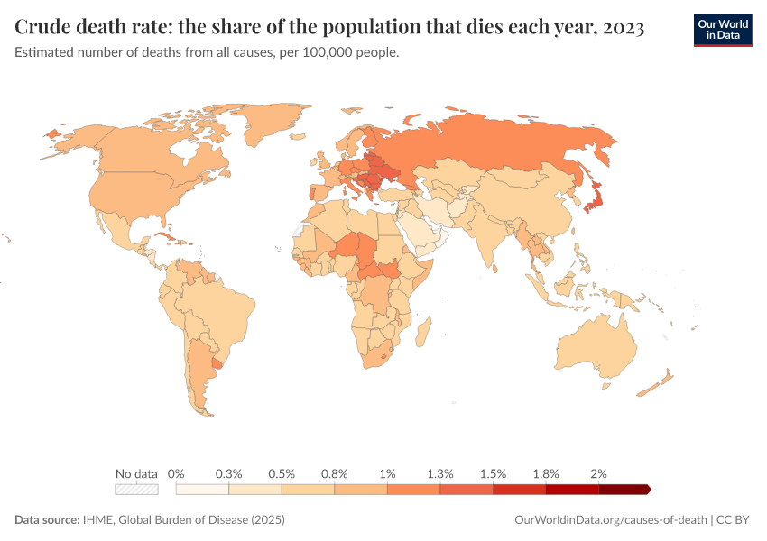 IHME, Global Burden of Disease (2025) – with major processing by Our World in Data. “Crude death rate: the share of the population that dies each year” [dataset]. IHME, Global Burden of Disease, “Global Burden of Disease - Deaths” [original data]. Retrieved March 4, 2026 from https://refactor-hide-legend.owid.pages.dev/grapher/crude-death-rate-the-share-of-the-population-that-dies-each-year-gbd