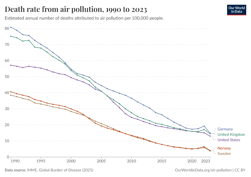 IHME, Global Burden of Disease (2025) – with major processing by Our World in Data. “Death rate from air pollution” [dataset]. IHME, Global Burden of Disease, “Global Burden of Disease - Risk Factors - Deaths” [original data]. Retrieved March 4, 2026 from https://refactor-hide-legend.owid.pages.dev/grapher/death-rate-from-air-pollution-per-100000