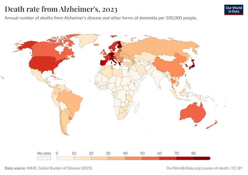 IHME, Global Burden of Disease (2025) – with major processing by Our World in Data. “Death rate from Alzheimer's” [dataset]. IHME, Global Burden of Disease, “Global Burden of Disease - Deaths” [original data]. Retrieved March 4, 2026 from https://refactor-hide-legend.owid.pages.dev/grapher/death-rate-from-alzheimers-other-dementias-gbd