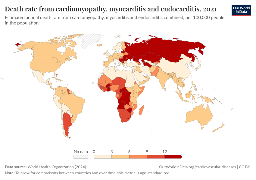 World Health Organization (2024) – with major processing by Our World in Data. “Death rate from cardiomyopathy, myocarditis and endocarditis” [dataset]. World Health Organization, “Global Health Estimates” [original data]. Retrieved March 4, 2026 from https://refactor-hide-legend.owid.pages.dev/grapher/death-rate-from-cardiomyopathy-myocarditis-endocarditis-who-ghe-age-standardized