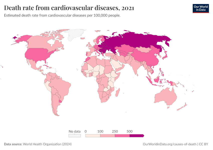 World Health Organization (2024) – with major processing by Our World in Data. “Death rate from cardiovascular diseases” [dataset]. World Health Organization, “Global Health Estimates” [original data]. Retrieved March 4, 2026 from https://refactor-hide-legend.owid.pages.dev/grapher/death-rate-from-cardiovascular-disease-ghe
