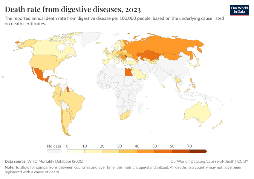 “Data Page: Death rate from digestive diseases”, part of the following publication: Saloni Dattani, Fiona Spooner, Hannah Ritchie, and Max Roser (2023) - “Causes of Death”. Data adapted from WHO Mortality Database. Retrieved from https://refactor-hide-legend.owid.pages.dev/grapher/death-rate-from-digestive-diseases-who-mdb [online resource]How to cite this data
