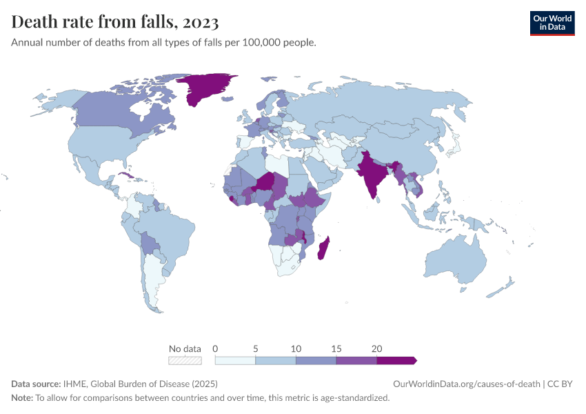 IHME, Global Burden of Disease (2025) – with major processing by Our World in Data. “Death rate from falls” [dataset]. IHME, Global Burden of Disease, “Global Burden of Disease - Deaths” [original data]. Retrieved March 4, 2026 from https://refactor-hide-legend.owid.pages.dev/grapher/death-rate-from-falls-gbd