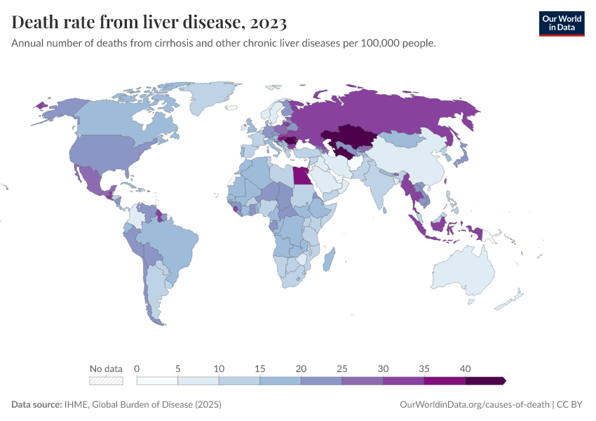 IHME, Global Burden of Disease (2025) – with major processing by Our World in Data. “Death rate from liver disease” [dataset]. IHME, Global Burden of Disease, “Global Burden of Disease - Deaths” [original data]. Retrieved March 4, 2026 from https://refactor-hide-legend.owid.pages.dev/grapher/death-rate-from-liver-disease-gbd