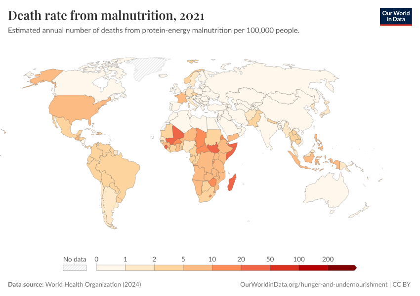 World Health Organization (2024) – with major processing by Our World in Data. “Death rate from malnutrition” [dataset]. World Health Organization, “Global Health Estimates” [original data]. Retrieved March 4, 2026 from https://refactor-hide-legend.owid.pages.dev/grapher/death-rate-from-malnutrition-ghe