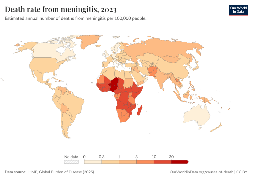 IHME, Global Burden of Disease (2025) – with major processing by Our World in Data. “Death rate from meningitis” [dataset]. IHME, Global Burden of Disease, “Global Burden of Disease - Deaths” [original data]. Retrieved March 4, 2026 from https://refactor-hide-legend.owid.pages.dev/grapher/death-rate-from-meningitis-gbd