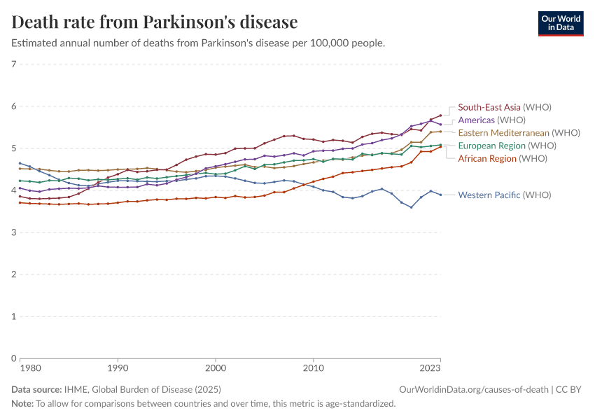 IHME, Global Burden of Disease (2025) – with major processing by Our World in Data. “Death rate from Parkinson's disease” [dataset]. IHME, Global Burden of Disease, “Global Burden of Disease - Deaths” [original data]. Retrieved March 4, 2026 from https://refactor-hide-legend.owid.pages.dev/grapher/death-rate-from-parkinsons-disease