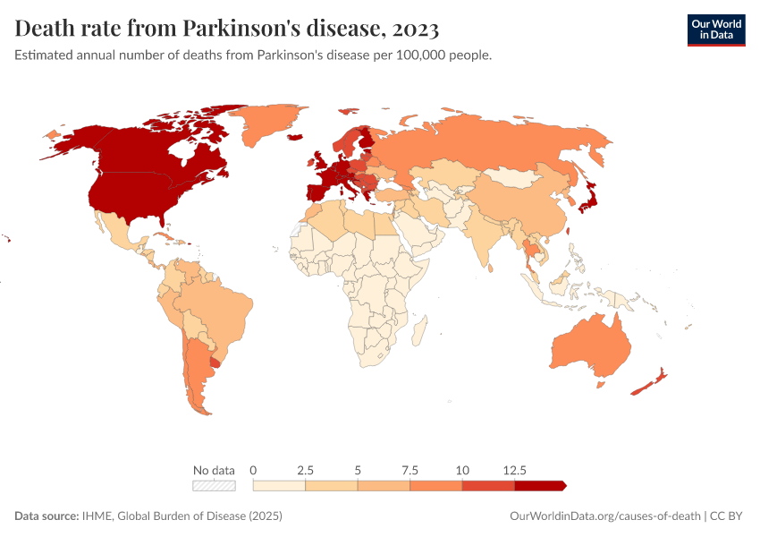 “Data Page: Death rate from Parkinson's disease”, part of the following publication: Esteban Ortiz-Ospina and Max Roser (2016) - “Global Health”. Data adapted from IHME, Global Burden of Disease. Retrieved from https://refactor-hide-legend.owid.pages.dev/grapher/death-rate-from-parkinsons-disease-gbd [online resource]How to cite this data