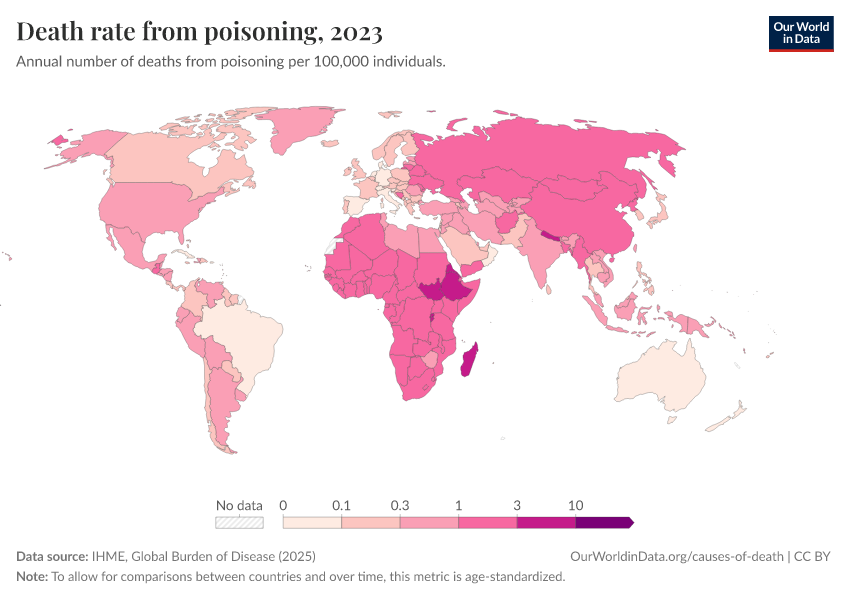 IHME, Global Burden of Disease (2025) – with major processing by Our World in Data. “Death rate from poisoning” [dataset]. IHME, Global Burden of Disease, “Global Burden of Disease - Deaths” [original data]. Retrieved March 4, 2026 from https://refactor-hide-legend.owid.pages.dev/grapher/death-rate-from-poisoning
