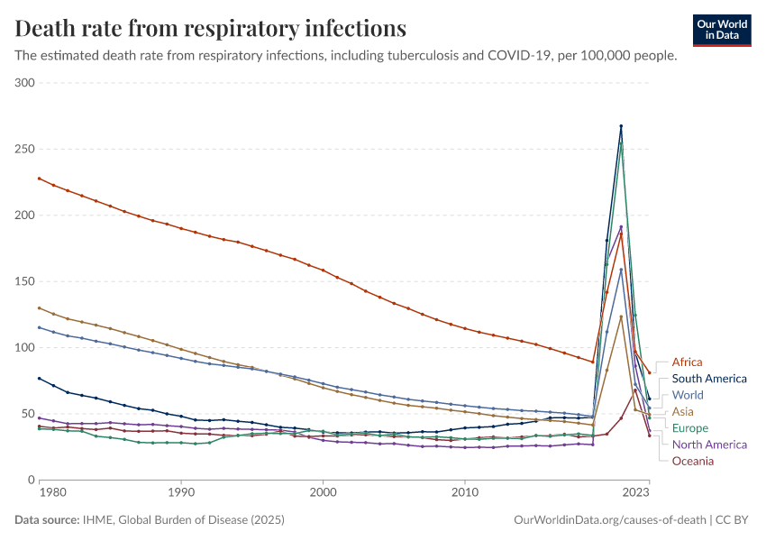 IHME, Global Burden of Disease (2025) – with major processing by Our World in Data. “Death rate from respiratory infections” [dataset]. IHME, Global Burden of Disease, “Global Burden of Disease - Deaths” [original data]. Retrieved March 4, 2026 from https://refactor-hide-legend.owid.pages.dev/grapher/death-rate-from-respiratory-infections-gbd
