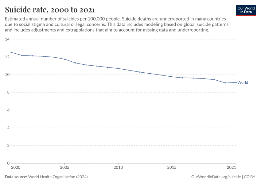 World Health Organization (2024) – with major processing by Our World in Data. “Suicide rate” [dataset]. World Health Organization, “Global Health Estimates” [original data]. Retrieved March 4, 2026 from https://refactor-hide-legend.owid.pages.dev/grapher/death-rate-from-suicides-ghe