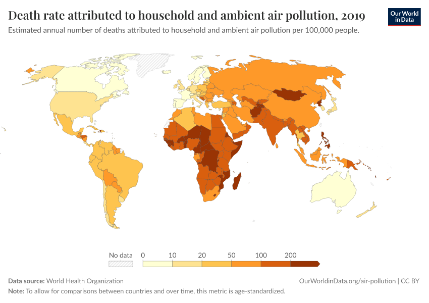 World Health Organization – processed by Our World in Data. “Death rate attributed to household and ambient air pollution” [dataset]. World Health Organization, “Global Health Observatory (GHO), World Health Organisation (WHO)” [original data]. Retrieved March 4, 2026 from https://refactor-hide-legend.owid.pages.dev/grapher/death-rate-household-and-ambient-air-pollution
