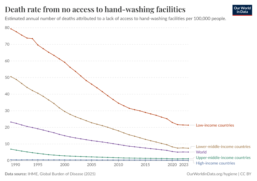 IHME, Global Burden of Disease (2025) – with major processing by Our World in Data. “Death rate from no access to hand-washing facilities” [dataset]. IHME, Global Burden of Disease, “Global Burden of Disease - Risk Factors - Deaths” [original data]. Retrieved March 4, 2026 from https://refactor-hide-legend.owid.pages.dev/grapher/death-rates-no-handwashing