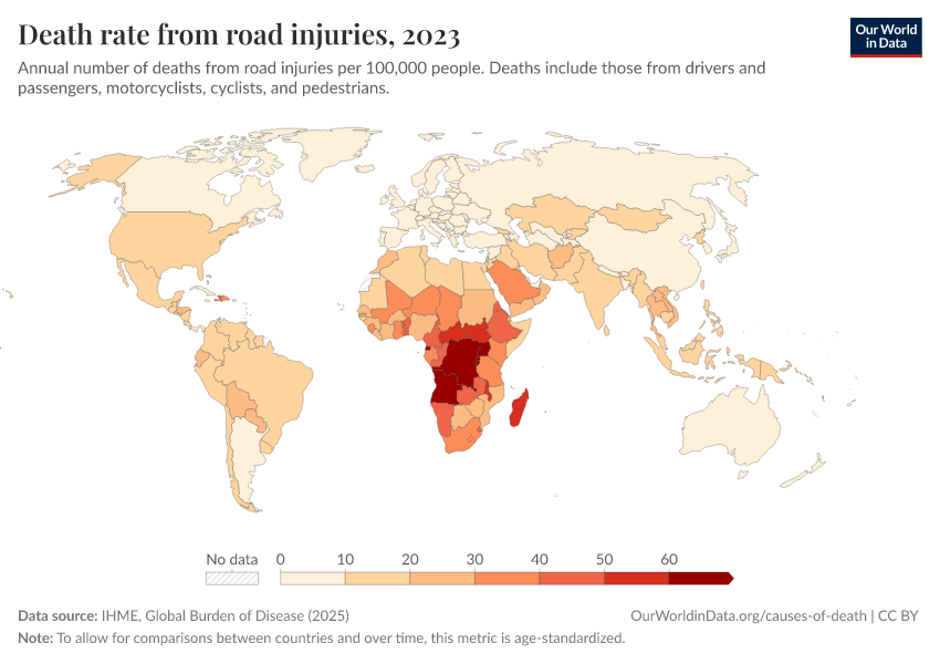 IHME, Global Burden of Disease (2025) – with major processing by Our World in Data. “Death rate from road injuries” [dataset]. IHME, Global Burden of Disease, “Global Burden of Disease - Deaths” [original data]. Retrieved March 4, 2026 from https://refactor-hide-legend.owid.pages.dev/grapher/death-rates-road-incidents