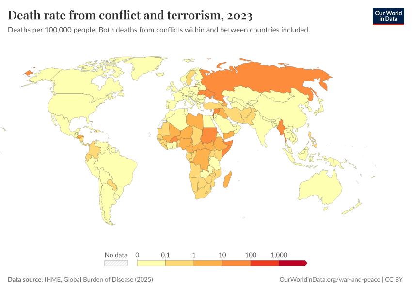 IHME, Global Burden of Disease (2025) – with major processing by Our World in Data. “Death rate from conflict and terrorism” [dataset]. IHME, Global Burden of Disease, “Global Burden of Disease - Deaths” [original data]. Retrieved March 4, 2026 from https://refactor-hide-legend.owid.pages.dev/grapher/deaths-conflict-terrorism-per-100000