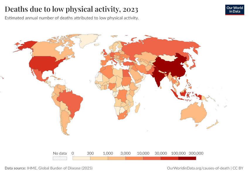 “Data Page: Deaths due to low physical activity”, part of the following publication: Esteban Ortiz-Ospina and Max Roser (2016) - “Global Health”. Data adapted from IHME, Global Burden of Disease. Retrieved from https://refactor-hide-legend.owid.pages.dev/grapher/deaths-due-to-low-physical-activity [online resource]How to cite this data